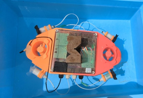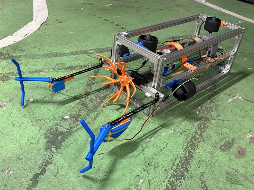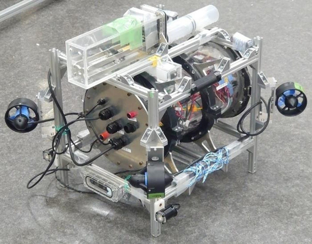| 機体は基板やバッテリーなどを格納する筒形の水密容器とアルミフレームで構成される。 アルミフレームを採用した理由は、スラスタの角度や位置の変更がしやすく、センサやアーム等のモジュールの拡張性に優れるためである。 スラスタは、推進用 2 基と潜行用 2 基の計 4 基としたことで、最小構成ながら必要な運動自由度を実現している。また、浮心と重心の位置を適切にとることにより復原力を確保し、ロール方向のスラスタを削減している。 姿勢推定には 9軸 IMU、目標物の位置推定にはカメラと超音波センサを組み合わせて用いる。 機体前部には 3D プリンタを用いて製作したアームを搭載し、関節をサーボモータで駆動する。 水密容器内には注射器を用いた注排水装置を搭載しており、機体のトリム調整を容易に行うことができる。 機体の運動制御や状況判断は、センサからの情報を水密容器内のコンピュータで処理することで行われる。 |