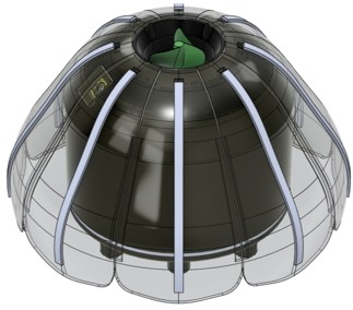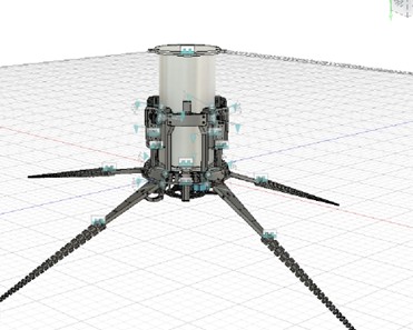 | 本機体は、タコが泳ぐ際の足の開閉動作に着想を得て作成した水中ロボットである。 図 に示すように、4 つのサーボ駆動ヒレ、4 基のピストンバラストタンク、1 基の二重反転スラスタを搭載しており、ヒレによる抗力調整、バラストによる浮力・姿勢制御、二基のモータを用いたスラスタによる推力・反トルク制御を組み合わせることで、水中での多様かつ柔軟な移動を実現する。 また、複数のバラスト間の水量を調整することで、浮上・潜航に加えて重心と浮心の位置を変化させ、姿勢変化による視界確保や移動の補助にも寄与する。 さらに、ヒレ先端には、生物模倣のアーム「Spirobs」を参考にした多自由度のワイヤー駆動アームを取り付けており、これによって物体の把持や推進補助に加え、生物的な外観を演出している。 これらの機構を、防水性を保ちつつコンパクトに収めるため、防水容器やコネクタは新たに自作することで防水性能と整備性の両立を図っている。 |