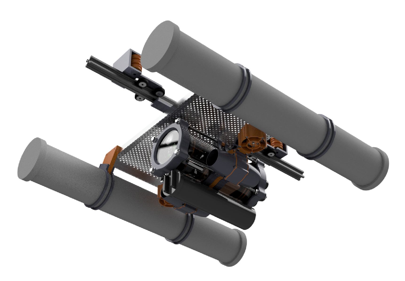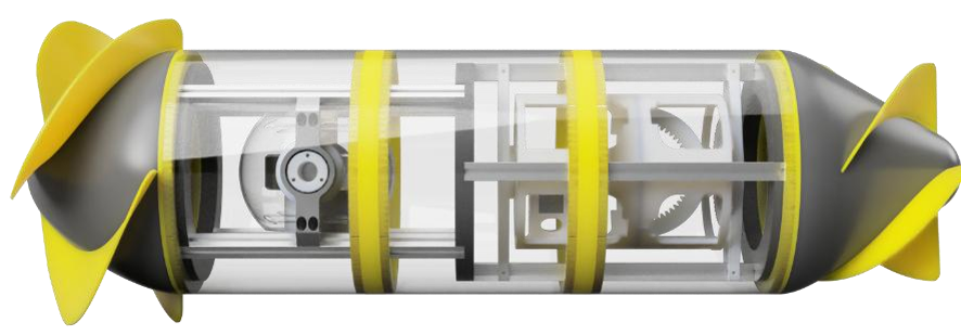 | 機体は、推進機構、旋回機構、外殻の3つの部分に分けられる。 推進機構は、機体全体が回転する方法としてジャイロ効果を応用した自己開発の GUP (Gyroscopic Underwater Propulsion)システムを用いる。機体内部で高速回転させたジャイロをステッピングモーターで周期的に傾けることで、機体全体を回転させる。 旋回機構は、GUP システムのジャイロの回転軸を機体の回転軸に重ねたものであり、これによりジャイロ効果が機体の回転ではなく、ピッチ及びヨーの操作をする。この機構により、機体の進行方向を自由に制御することが可能となる。 外殻については、機体全体がスクリュー型のシェルを用い、機体全体が回転することで前進できる。 本機体は完全に密閉された水中ロボットの製作が目的としたもので、最低限の機能を備えた試作機である。 |
