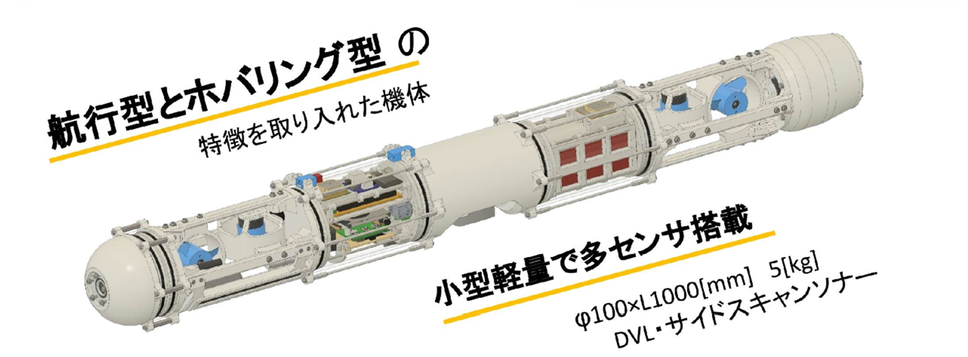 | 渓流、河川などの深度が浅く流れの速い水域での調査を目的とした機体。流体抵抗削減のため細長い胴体と 2 基のスラスタ、2 枚の翼を有し、流れに逆らい航行・調査を行う。 流水中で安定した動作を行うため上流に機首を向けた状態を基本姿勢とし、推力制御によりサージ方向の移動及びホバリングを行う。スウェー・ヒーブ方向の移動には舵面を用いたヨー・ピッチ制御で釣り合いを変化させる事で行う。また機首方向を保持するため、尾翼を後方に配置し水流に対する風見安定を確保している他、9 軸センサーを用いた PD 制御も併用する事で、安定性を高めている。 操縦、調査時の映像撮影用にカメラを搭載している。機首方向が固定される事から超広角カメラを採用し広範囲の映像を撮影する。また翼を用いた制御により重量変化に強い事から、将来的には機体下部に追加のカメラその他の装備品や、定点観測向けに水底に機体を固定するアンカーを装備する事も予定している。 |