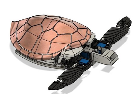 | 水中環境での調査や探索を想定して開発したウミガメ型の生物模倣ロボット。前肢 2 つと後肢 2 つを用いて前進、旋回、潜水、浮上などの動作を行う。前肢にはそれぞれ 3 軸を設けており、実際のウミガメに近い可動域を有している。羽ばたきの軌跡もウミガメの観察に基づいて作成し、安定した遊泳が行える。また、前肢のフラッピングは一枚板ではなく、細かく分割してあるため滑らかなねじれ動作を実現している。ウミガメが持つ流体特性により、消費エネルギーが低いため長時間の連続動作に適している。ROS2 によりゲームコントローラから有線で操縦を行う。今後は機体前方に小型カメラを取り付けて実際に調査に使用できるような状態にすることも視野に入れている。 |