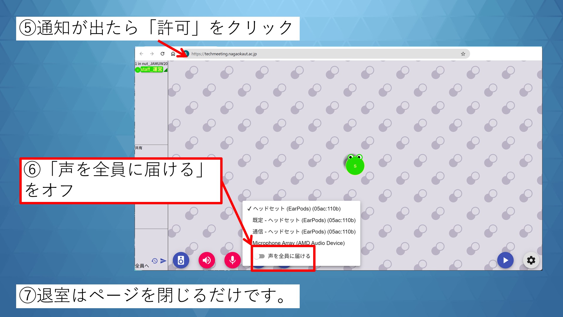 - 注意事項:参加後、「声を全員に届ける」をオフにしてください。