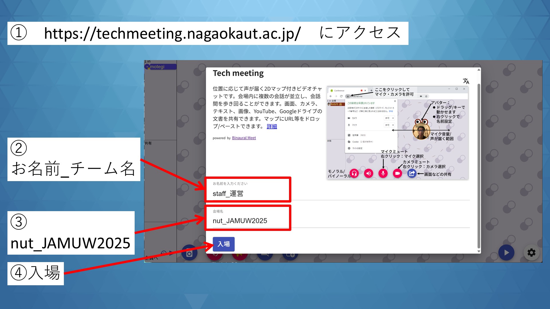 - 詳しい操作方法はこちら ( https://sites.google.com/vos.nagaokaut.ac.jp/tech-meeting )
